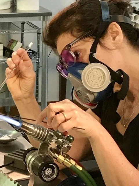 In 2015, Lois Dubin, the author of History of Beads introduced me to the magic of flame working. I began taking classes with some of the most talented artists in the field to date. I love painting with glass and appreciate all the guidance I have been given over the years.